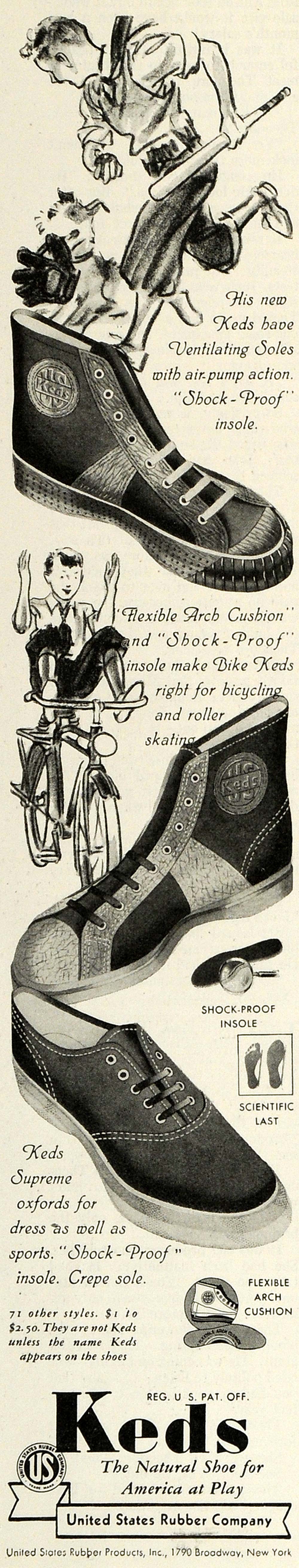 This is a small original 1937 black and white print ad for Keds oxfords with ventilating soles, flexible arch cushion and "Shock-Proof" insoles by the United States Rubber Company, located at 1790 Broadway, New York City, New York.