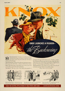 This is an original 1937 color print ad for Knox Backswing hats for men, a product by Knox the Hatter, located at Fifth Avenue at 40th Street in New York. This particular ad features artwork by Jay Hyde Barnum.