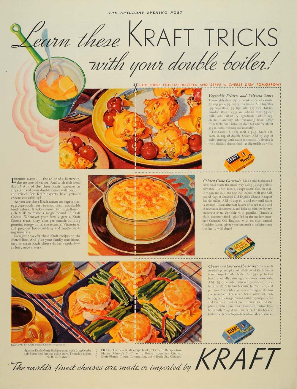 This is an original 1937 color print ad for Kraft Cheeses. This ad touches on the health benefits of Kraft Cheese, as it uses a gallon of milk to make a single pound of cheese. However, the ad's main focus centers around the delectable dishes that can be made with Kraft products, such as Golden Glow Casserole, Vegetable Fritters and Velveeta Sauce, and Cheese and Chicken Shortcake. By inserting a creative cut line with tiny scissors, the ad encourages consumers to clip and use the featured recipes, as well as markets its new, free Kraft recipe book, "Favorite Recipes from Marye Dahnke's File."