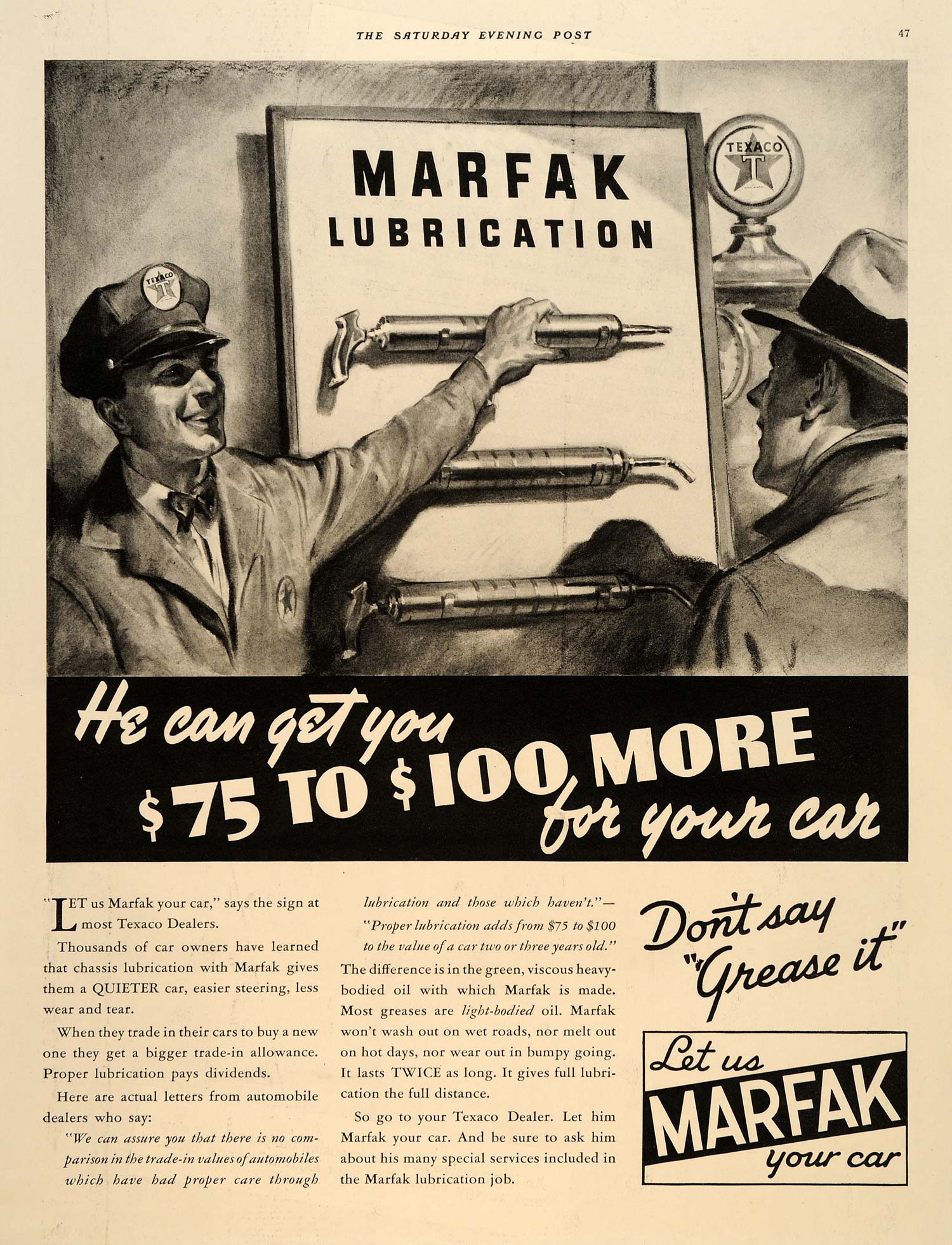 Keywords specific to this image: Marfak, Grease, Lubrication, Pricing, Texaco, Texas Company Vintage Advertising