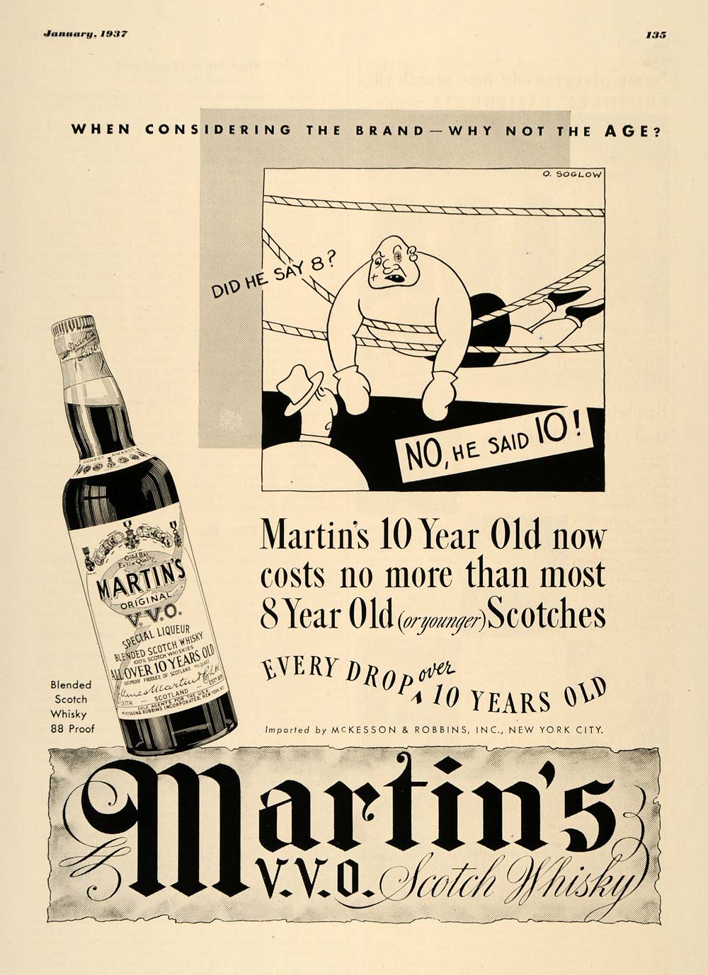 This is an original 1937 black and white print ad for Martins Original V. V. O. Special Liqueur Blended Scotch Whiskey imported by McKesson & Robbins Inc. located in New York.