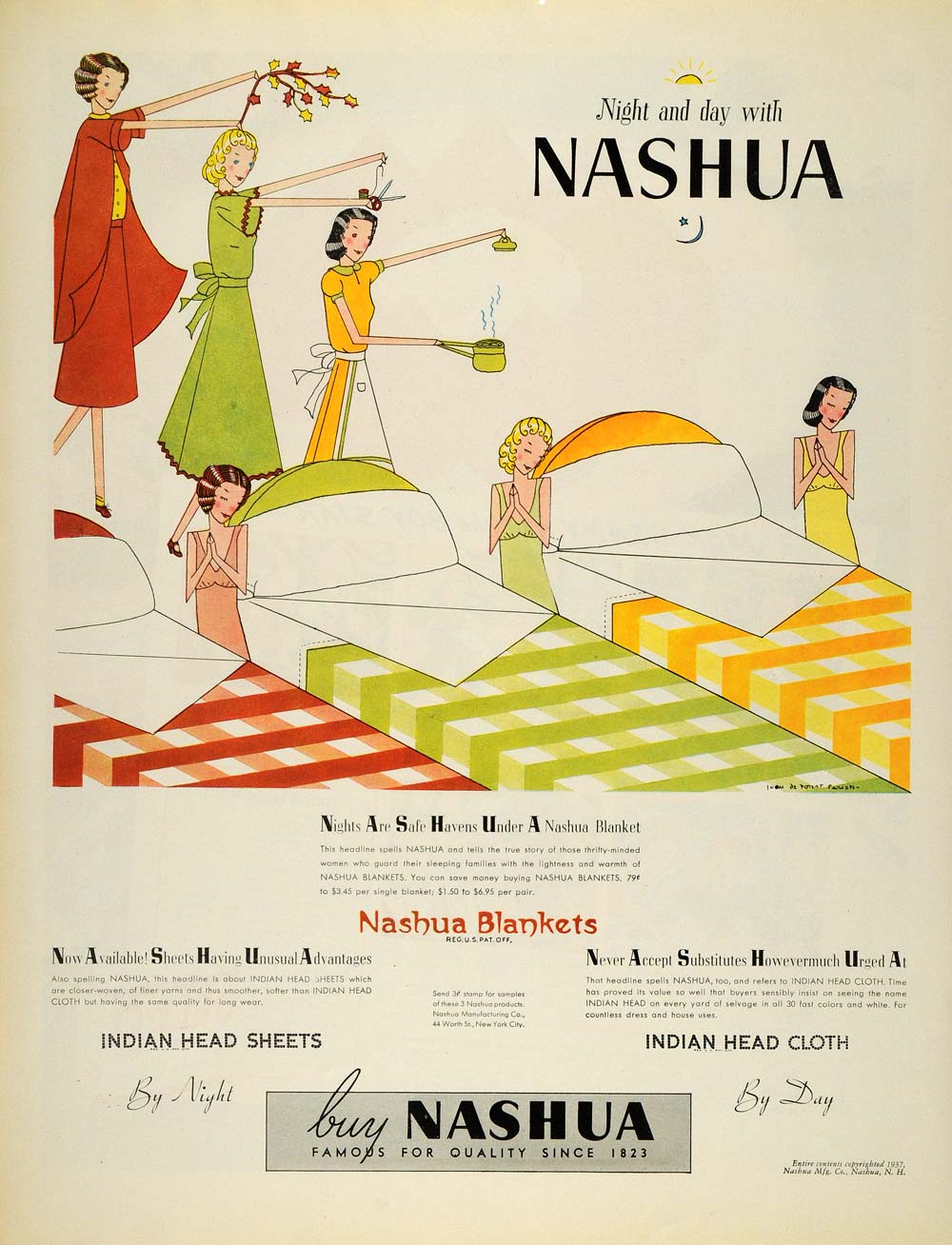 This is an original 1937 color print ad for the Nashua Manufacturing Company of Nashua, New Hampshire. This ad features their Indian Head Sheets, Head Cloth, and Blankets for bedtime.