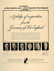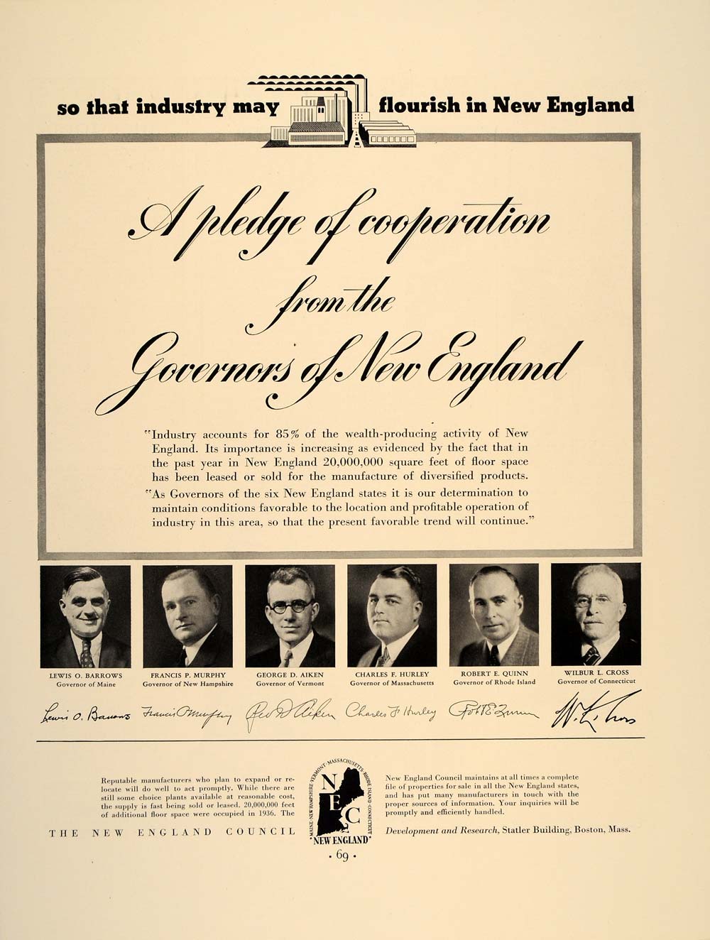 This is an original 1937 black and white print ad promoting industrial development in the New England states with a pledge of cooperation signed by the Governors of New England; Lewis O. Barrows, Governor of Maine; Francis P. Murphy, Governor of New Hampshire; George D. Aiken, Governor of Vermont; Charles F. Hurley, Governor of Massachusetts; Robert E. Quinn, Governor of Rhode Island; and Wilbur L. Cross, Governor of Connecticut.