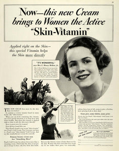 This is an original 1937 black and white print ad for Pond's of Clinton, Connecticut, featuring their Skin Vitamin Cold Cream for women's facial health and beauty, as used by Mrs. C. Henry Mellon, Jr.