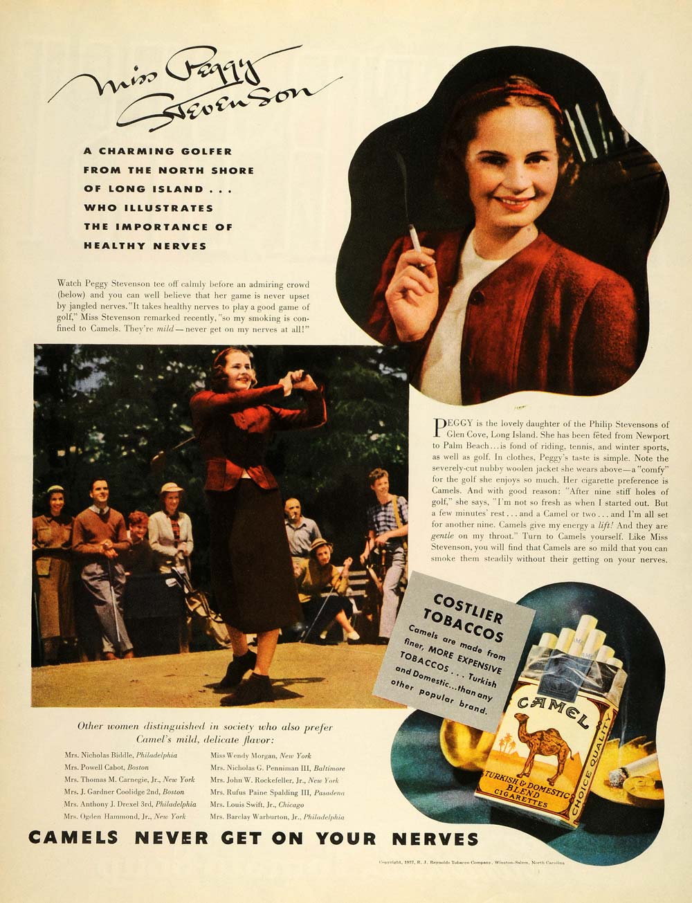 This is an original 1937 color print ad for the R. J. Reynolds Tobacco Company of Winston-Salem, North Carolina, featuring their Camel Cigarettes. This is a smokeable treat for Peggy Stevenson, the golfer from Long Island.