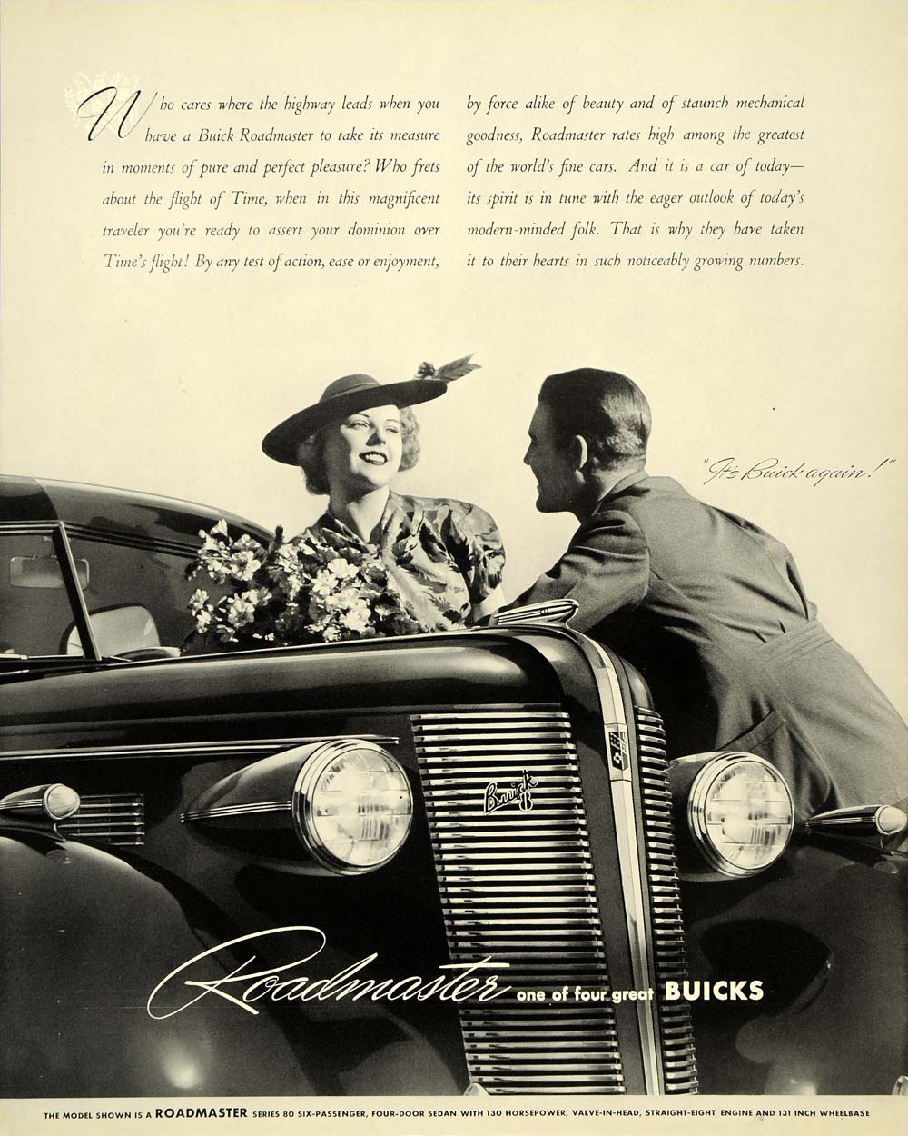 This is a beautiful original 1937 Great Depression Era black and white print ad for the Buick Roadmaster automobile.