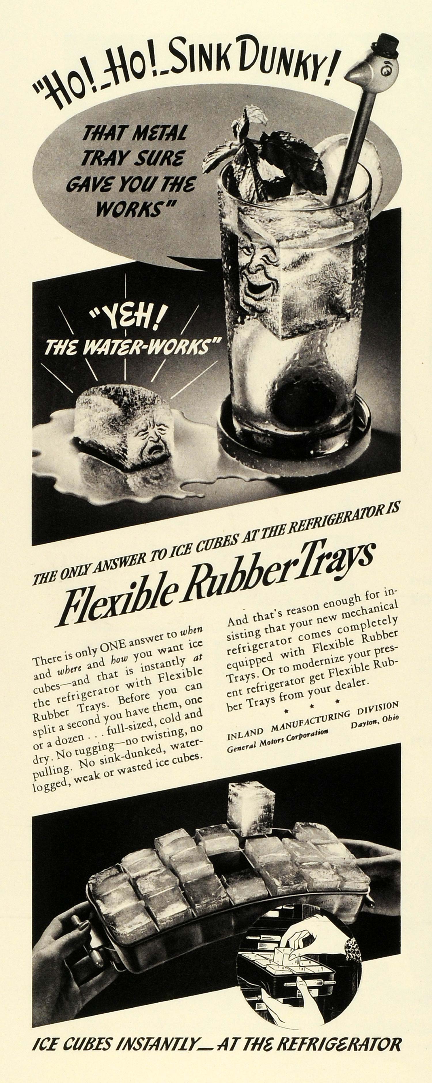 This is an original 1937 black and white print ad for flexible rubber ice cube trays from the Inland Manufacturing Division of Dayton, Ohio. The caption begins, "There is only ONE answer to when and where and how you want ice cubes-- that that is instantly at the refrigerator with Flexible Rubber Trays."