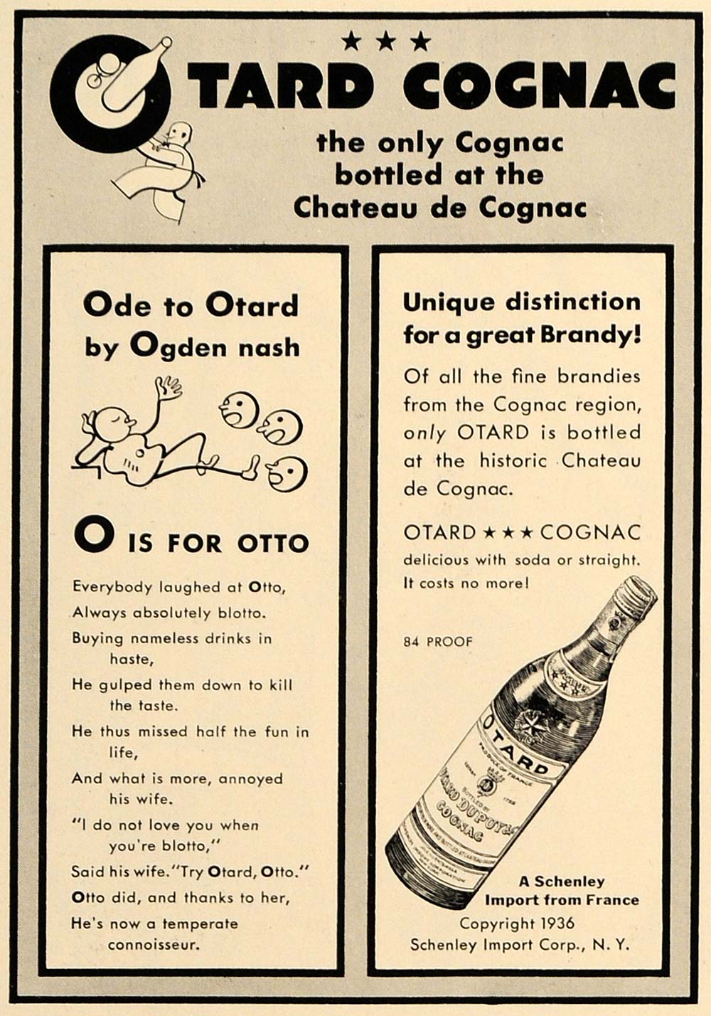 This is an original 1937 black and white print ad for Otard Cognac from the Schenley Import Corporation of New York. The ad writes, "Of all the fine brandies from the Cognac region, only Otard is bottled at the historic Chateau de Cognac".