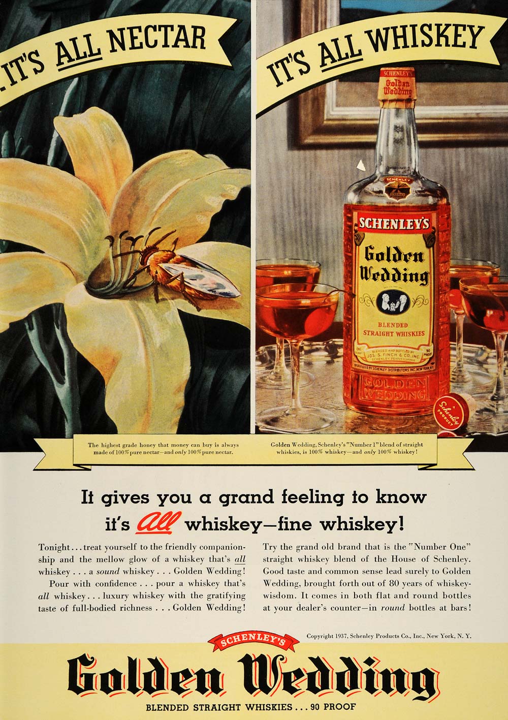 This 74+ year old Item is rated Near Mint / Very Fine+. Light aging throughout. No creases. No natural defects. No tears. No water damage. The small white blemish seen on the right side of this image,near the bottle of Golden Wedding does not appear on the original copy.
