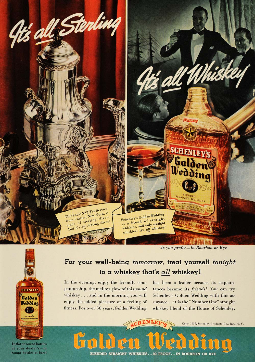 This is an original 1937 color print ad for Golden Wedding Blended Straight Whiskies from the Schenley Products Co. located in New York.
