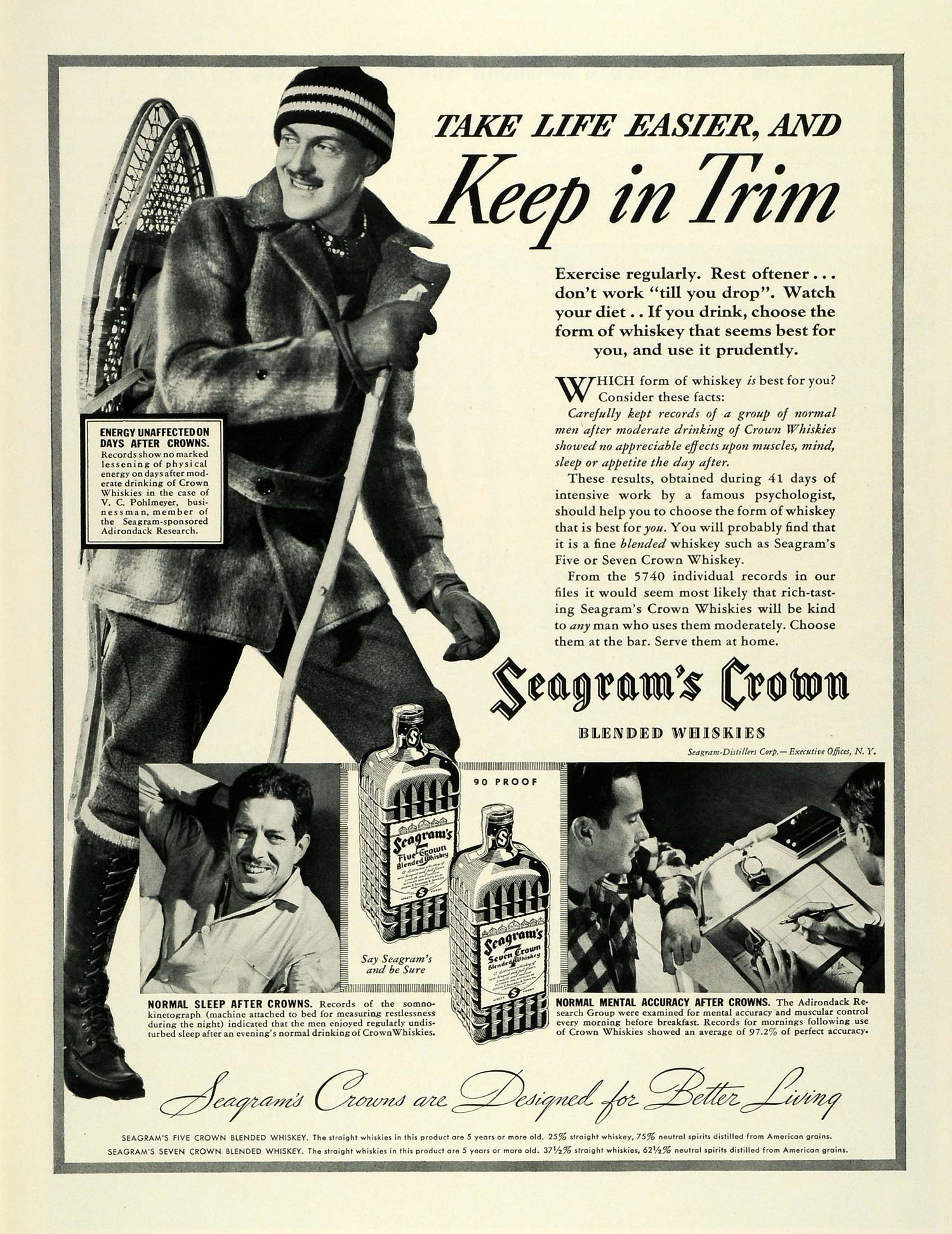 This is an original 1937 black and white print ad for Seagram's Crown Blended Whiskies.