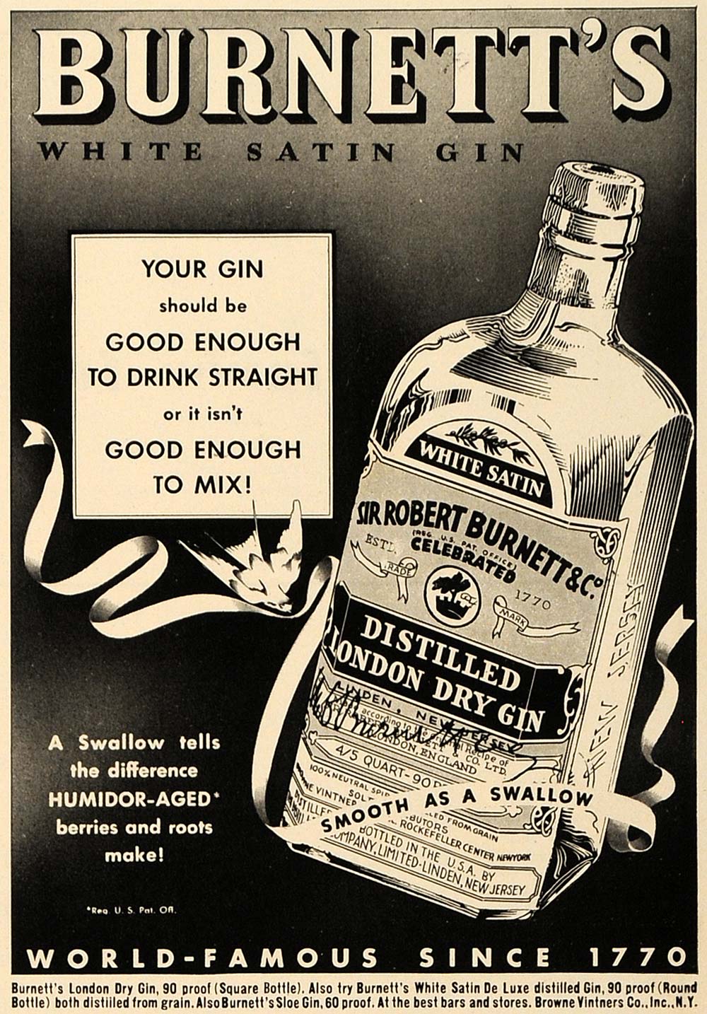 This is an original 1937 black and white print ad for Burnett's White Satin Gin by Sir Robert Burnett & Company.