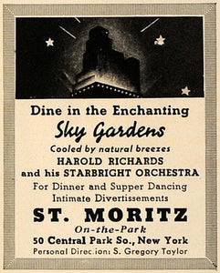 This is a small original 1937 black and white print ad for dining in the enchanting Sky Gardens where Harold Richards and his Starbright Orchestra perform. St. Moritz hotel is located at On-the-Park, 50 Central Park South, New York City. S. Gregory Taylor gives personal directions.