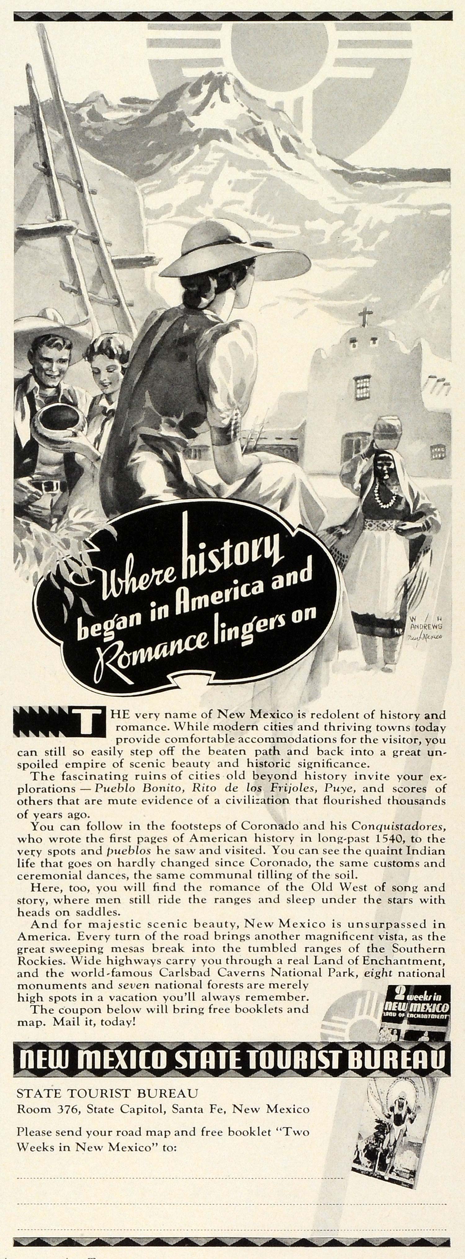 This is an original 1937 black and white print ad promoting travel to New Mexico from the State Tourist Bureau located in Santa Fe, New Mexico.
