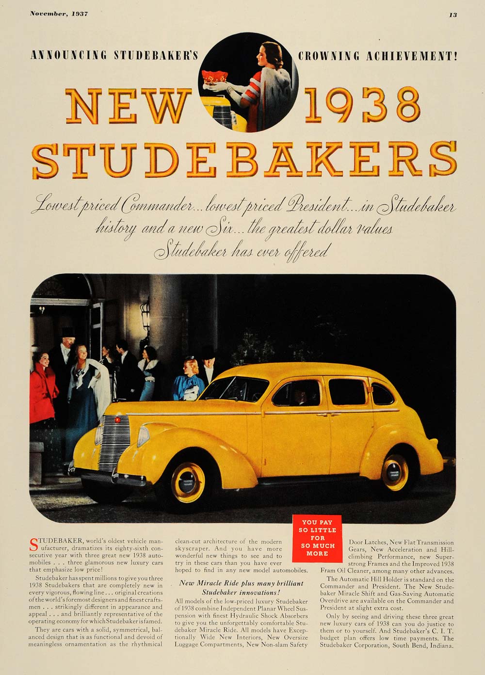 This is an original 1937 color print ad for the 1938 line of Studebaker automobiles including the Commander, President and Six. The Studebaker Corporation is located in South Bend, Indiana.
