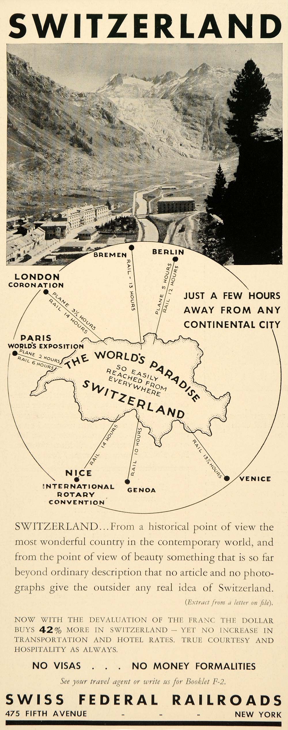 This is an original 1937 black and white print ad promoting travel in Switzerland from Swiss Federal Railroads located at 475 Fifth Avenue, New York.