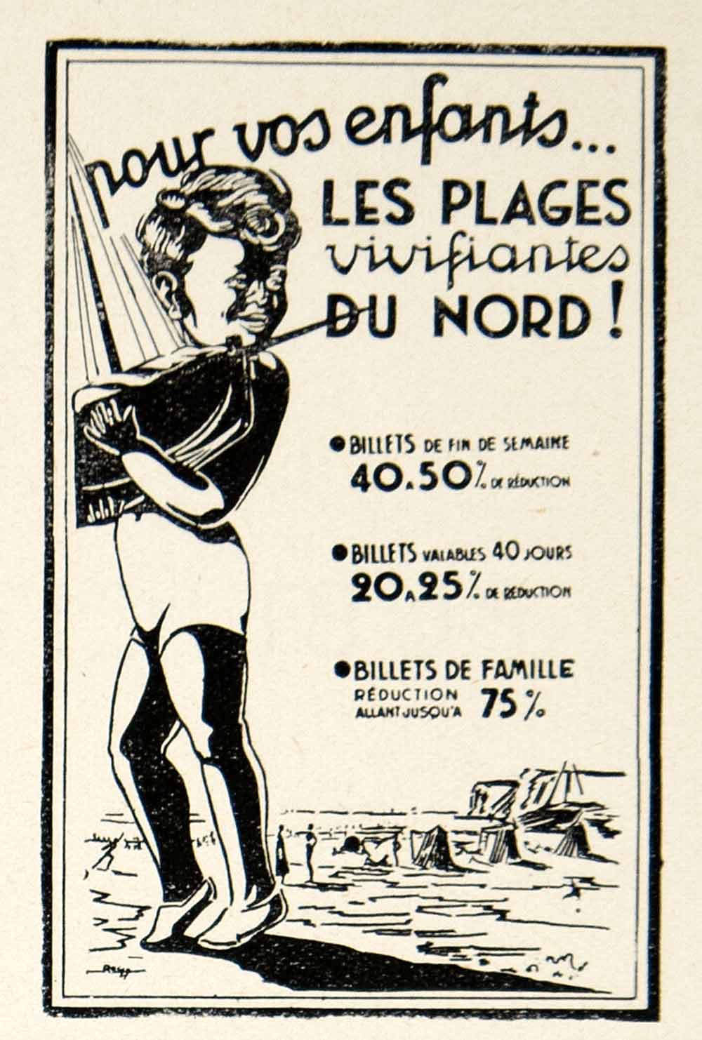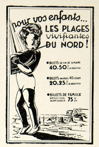This is an original 1937 black and white print ad for train travel to the beaches in the north of France.