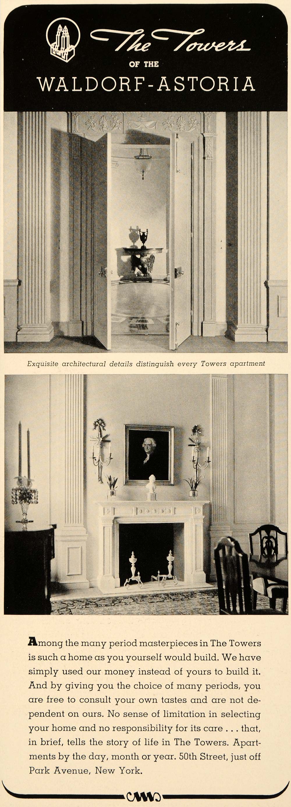 This is an original 1937 black and white print ad for the The Towers apartments of the Waldorf-Astoria located in New York.