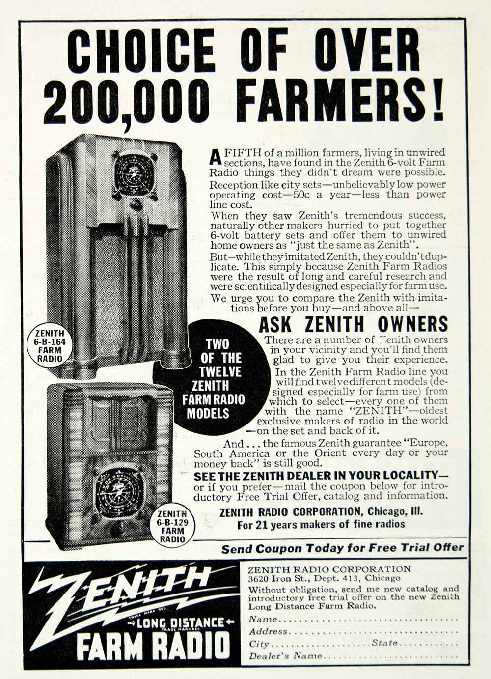 This is an original 1937 black and white print ad for the B-164 and B-129 six volt, long distance, farm stereo models that were made and sold by Zenith Radio Corporation.