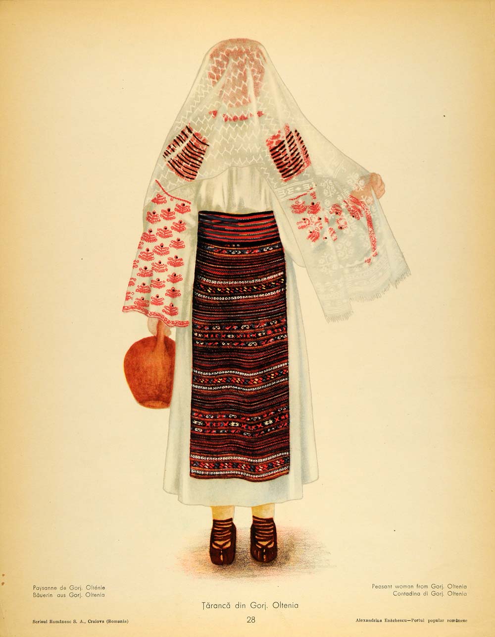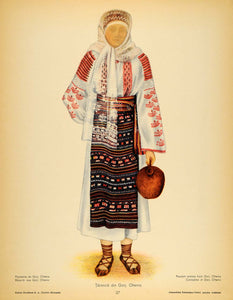 This is a set of two original 1937 color prints showing the front and back view of the folk costume worn by a peasant woman from Gorj County in the Oltenia area of Romania. Please see both images.