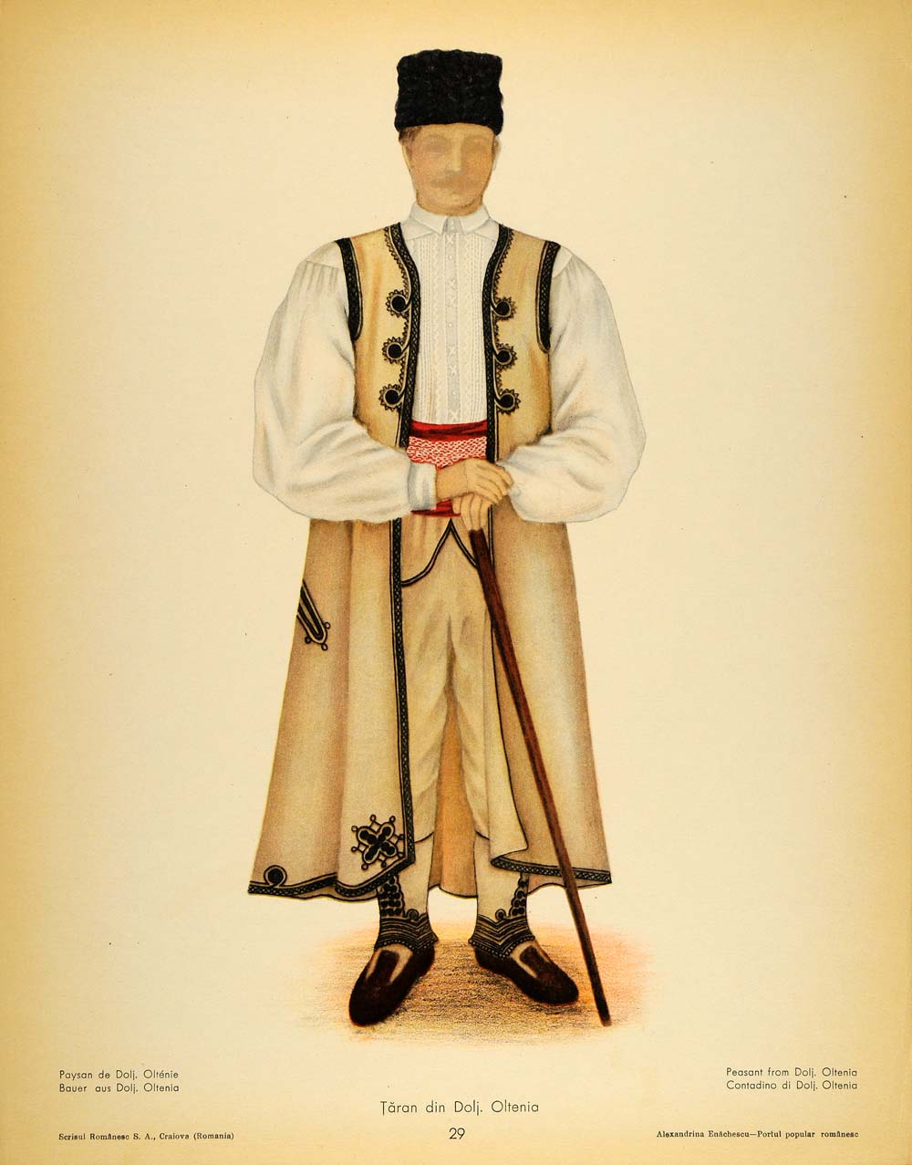 This is an original 1937 color print of the folk costume worn by a peasant man from Dolj County in the Oltenia area of Romania.