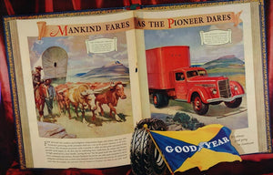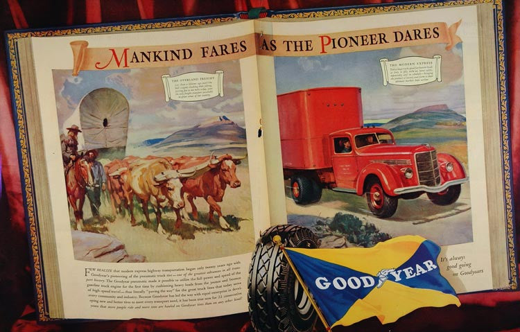 This is an original 1937 double-page, color print ad for Goodyear tires with a nice illustration of how freight transportation has changed from covered wagon to express truck.