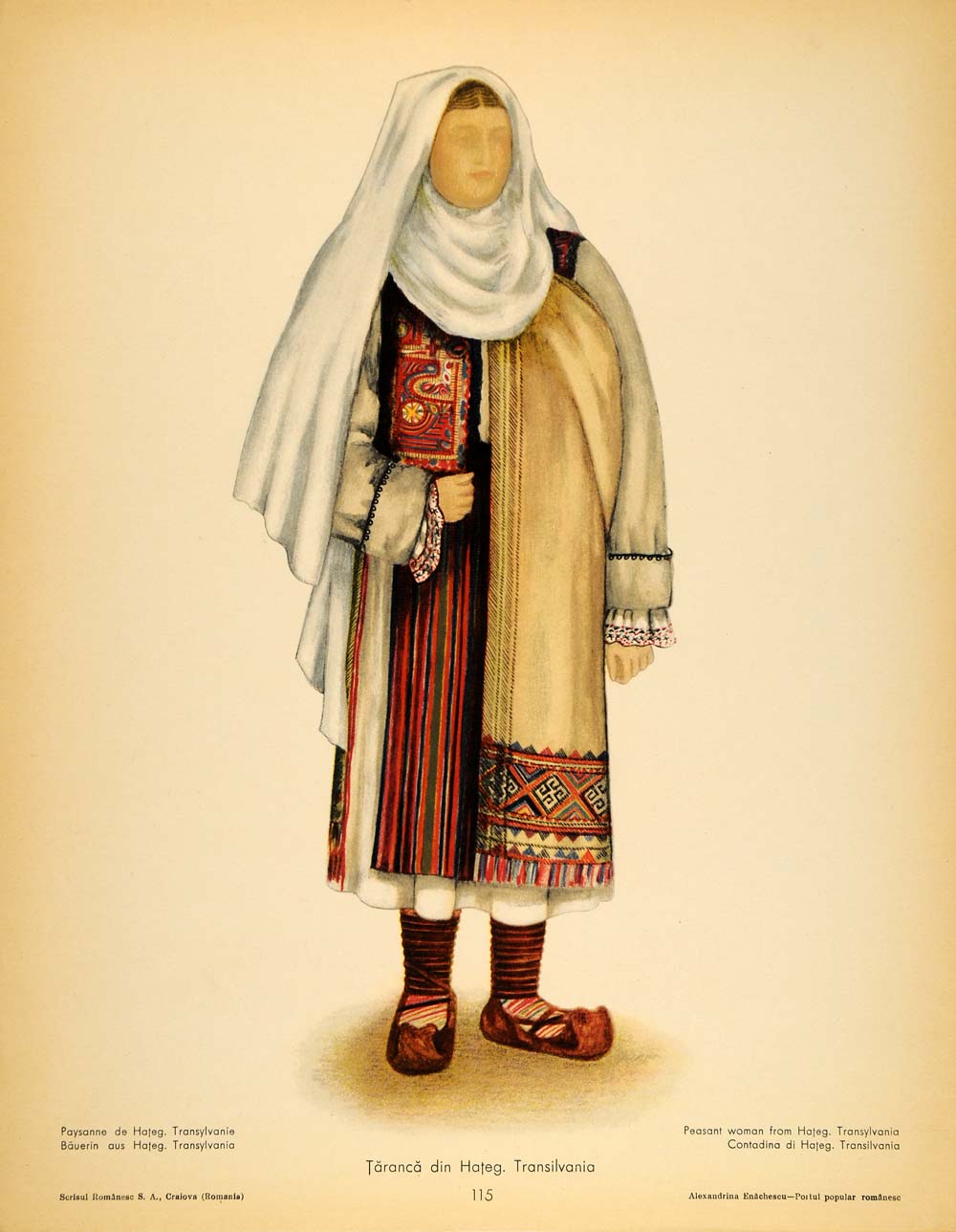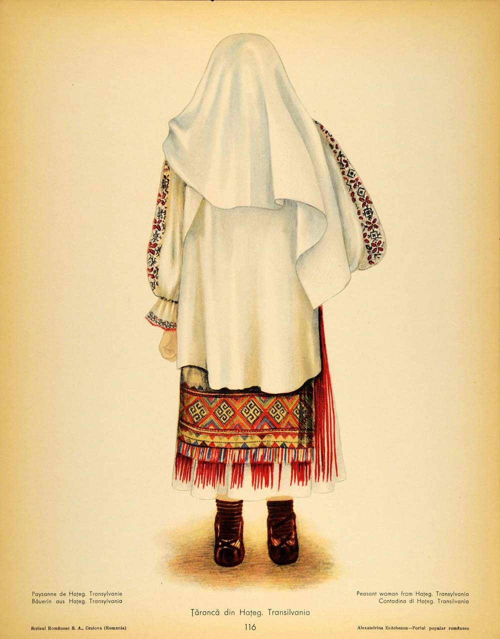 This is a set of two original 1937 color prints showing the front and back view of the folk costume worn by a peasant woman from Hateg County in the Transylvania region of Romania. Please see both images.