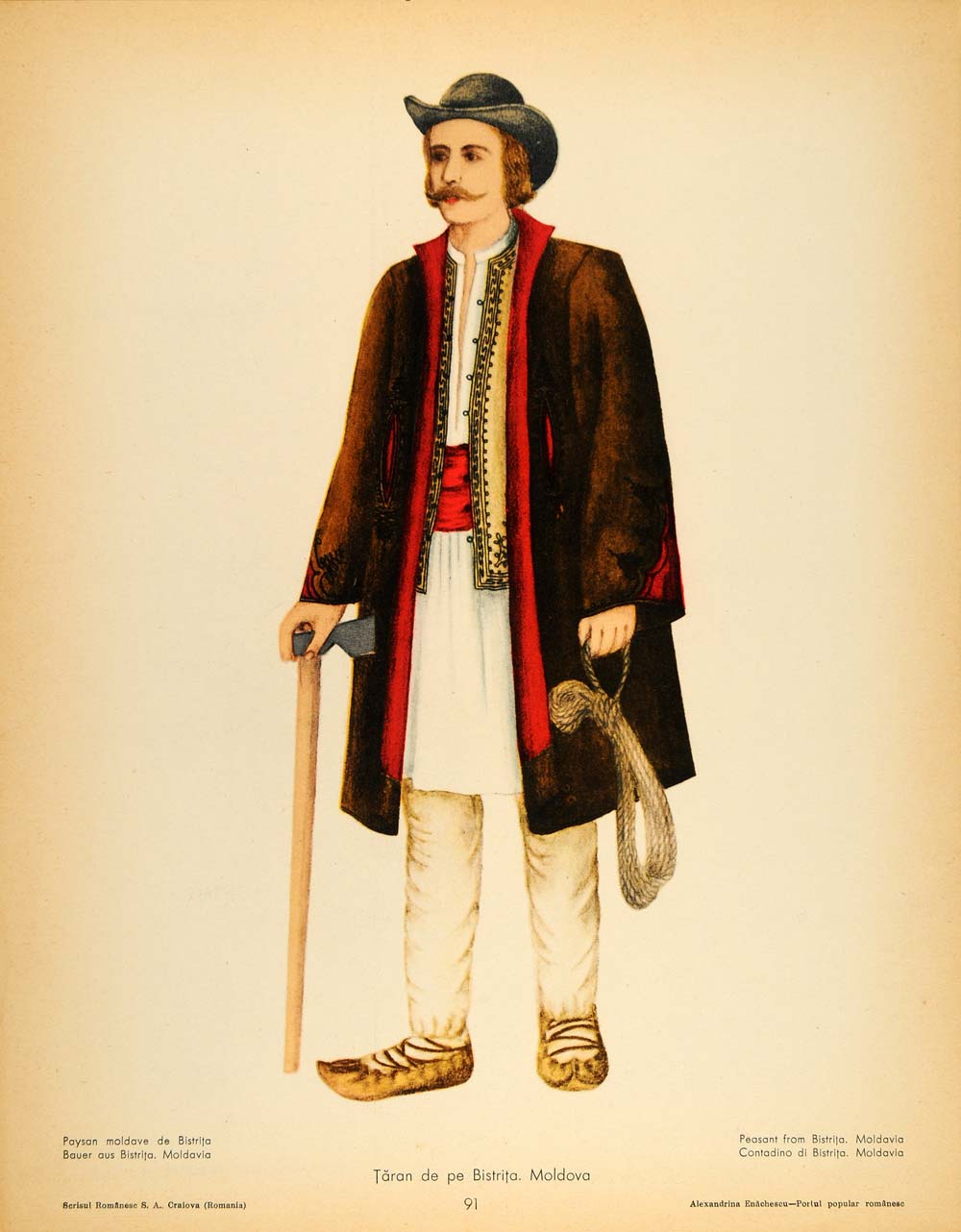 This is an original 1937 color print of the folk costume worn by a peasant man from Bistrita in the Moldavia (or Moldova) area of Romania.