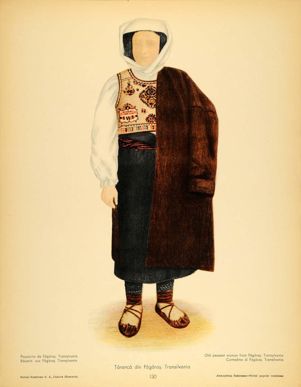 This is an original 1937 color print of the folk costume worn by a peasant woman from Fagaras in the Transylvania region of Romania.