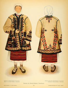 This is an original 1937 color print of the front and back view of the folk costume worn by a peasant woman from Bistrita Nasaud County in the Transylvania region of Romania.