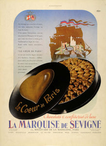 This is an original 1937 color (with gold ink) French print ad for Le Coeur de Paris Chocolates from La Marquise de SŽvignŽ.