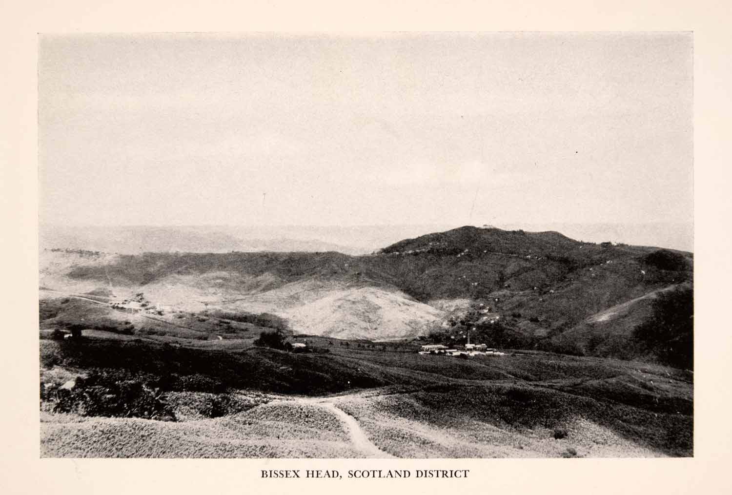 This is an original 1937 black and white halftone print of "Bissex Head, Scotland District." This image captures the Scotland District on the island of Barbados, a UNESCO World Heritage Site under the "Natural" category. The District is the site of several distinctive and unique geological, geographical, biological, and cultural features.