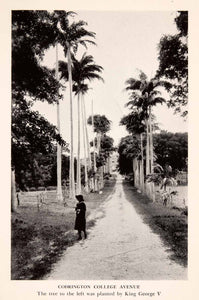 This is an original 1937 black and white halftone print of "Codrington College Avenue." The tree-lined road of Codrington College, an Angilican theological college in St. John, Barbados, is captured in this image.