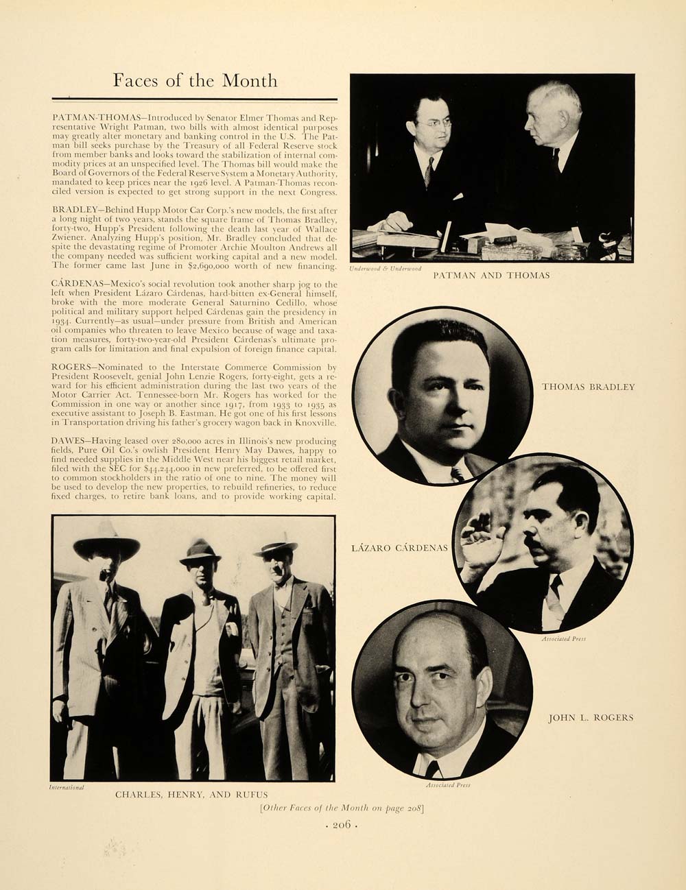 Keywords specific to this image: Patman Thomas, Senator Elmer Thomas, Representative Wright Patman, the Thomas Bill, The Patman Bill, Hupp Motor Car Corporation, Thomas Bradley, Wallace Zweiner, Archie Moulton Andrews, Mexico's Social Revolution, President Lazaro Cardenas, General Saturnino Cedillo, British and American Oil Companies, Interstate Commerce Commission, President Roosevelt, John Lenzie Rogers, Motor Carrier Act, Tennessee, Joseph B. Eastman, Knoxville, Illinois, Pure Oil Company, President Henry May Dawes, SEC,
