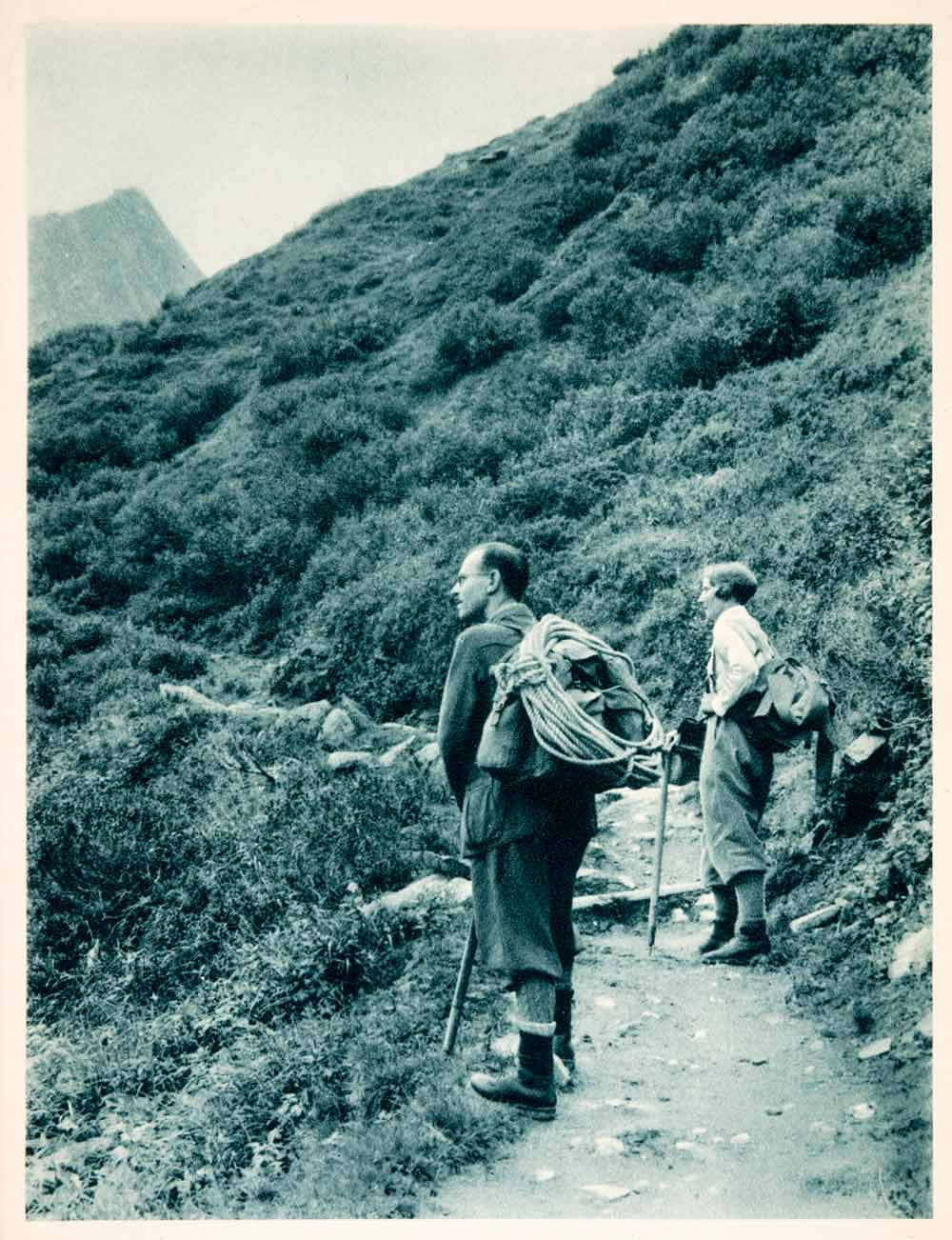 This is an original 1937 duotone photogravure of two travelers on a path in the Vent Valley of the Ötztal Alps in Tyrol, Austria. The man on the left is named Arthur Krischke.