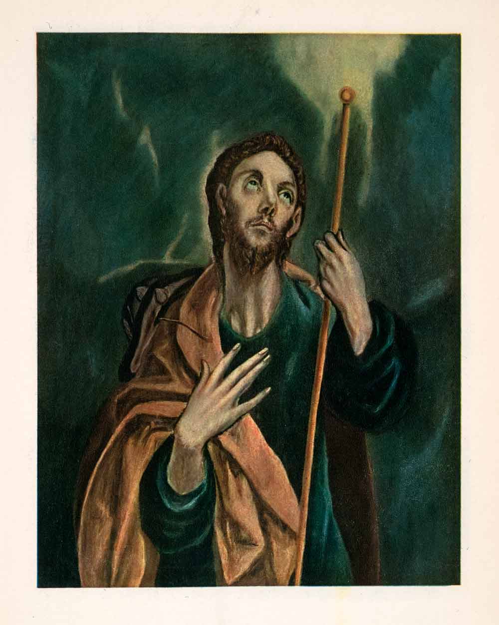 This is an original 1937 color photolithograph of a portrait painting of St. James the Great by El Greco in Toledo, Spain.