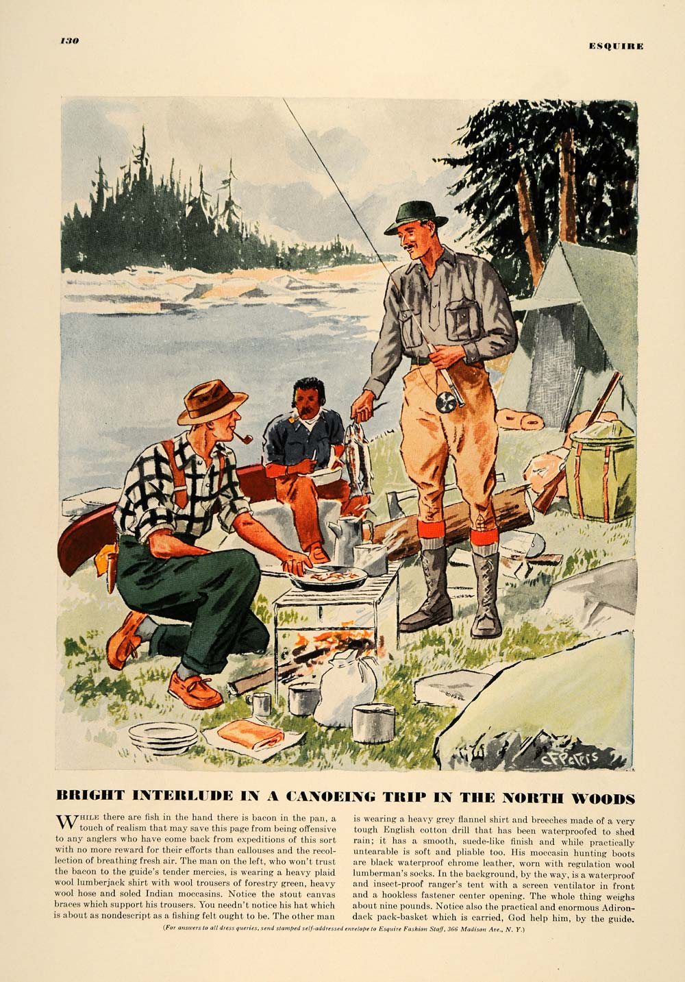 This is an original 1937 color print of a group of camping fishermen in fashionable clothing as approved by the Esquire Fashion Staff of 366 Madison Avenue in New York. The artwork in this ad is by the artist C. F. Peters.