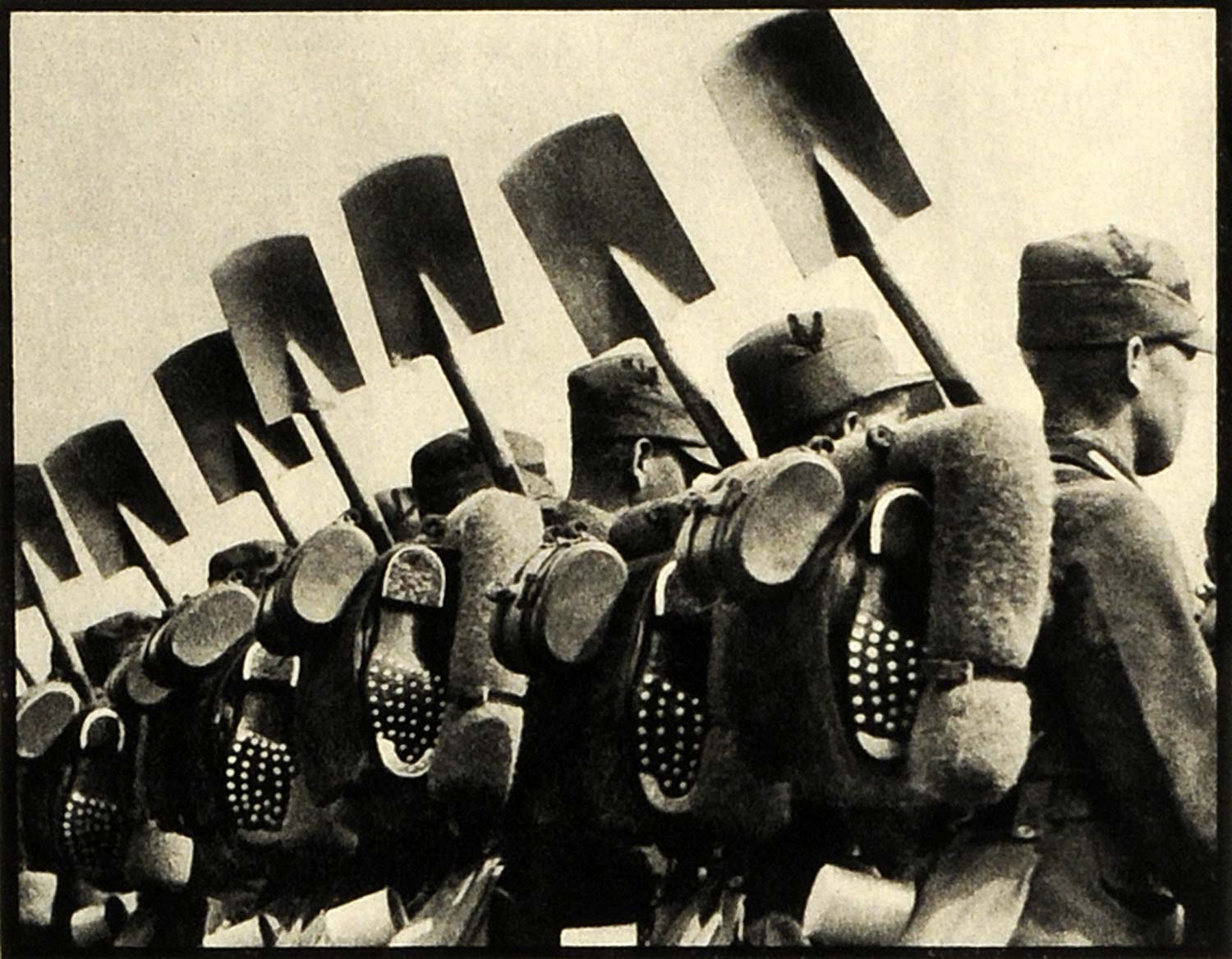 This is an original 1937 halftone print of men in the German Labor Service (Reichsarbeitsdienst). The program was established by the Third Reich to combat unemployment. The troops helped supply the military with food and ammunition, and they repaired roads and airstrips.