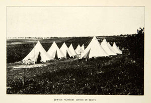 This is an original 1937 monochrome halftone print that depicts a campsite of Jewish pioneers in Israel.