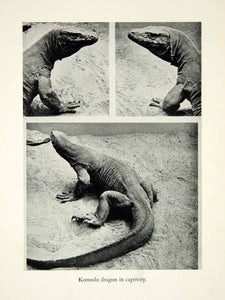This is an original 1937 black and white halftone print of a Komodo dragon (Varanus komodoensis) which is also known as a Komodo monitor. This largest living species of lizard is native to the Indonesian islands of Komodo, Runca, Flores, Gili Motang, and Padar. It can grow up to 10 feet long and are known to hunt in groups which is unique to this species of lizard. Komodo dragons are not poisonous but they do have septic bacteria in their saliva that can lead to dangerous infections if left untreated.