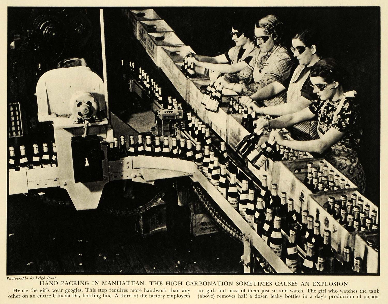 This is an original 1937 halftone print of women packing Canada Dry soft drinks in Manhattan, New York. The caption writes, "Hand packing in Manhattan: the high carbonation sometimes causes an explosion, hence the girls wear goggles. This step requires more handwork than any other on an entire Canada Dry bottling line. A third of the factory employees are girls but most of them just sit and watch..." Photography by Leigh Irwin.