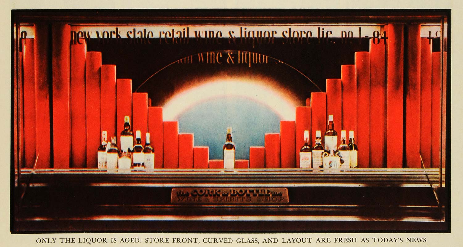 This is an original 1937 color print of a window front for the Cork & Bottle Wine and Spirits Shop in New York. The caption writes, "Only the liquor is aged: store front, curved glass, and layout are fresh as today's news." Photography by Leigh Irwin and Nicholas Langen.
