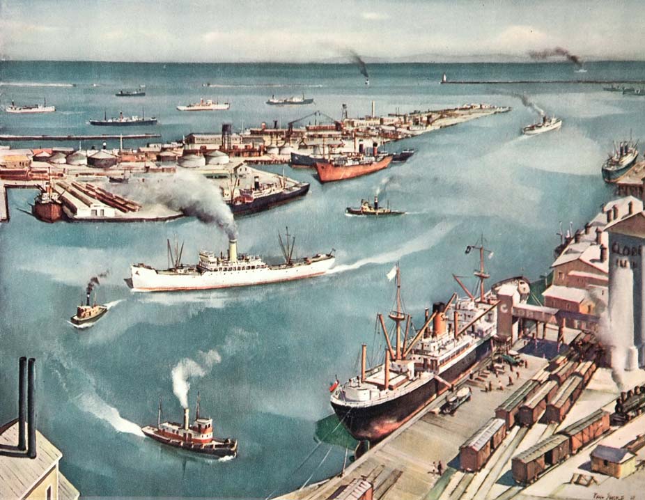This is an original 1937 color print of a painting of the Los Angeles intercoastal port.