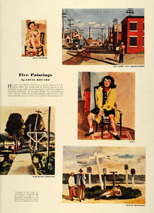 This is an original 1937 color print of five paintings by Louis Bouche. There is the "Best Period," "Sea View Ave., Bridgeport," "Jean," "Rural Delivery,"and "Railroad Crossing." Paintings on this page are reproduced in CHicago through the courtesy of the C. W. Kraushaar Art Galleries, 730 Fifth Avenue, New York, where they are on exhibition and sale.