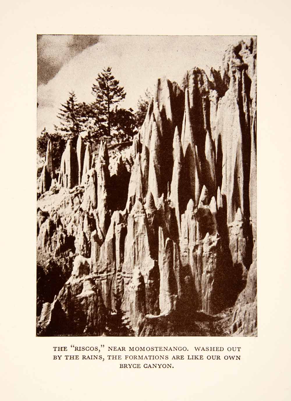 This is an original 1937 sepia halftone print of the Riscos de Momostenango which is an area of unusually shaped sandstone rock formation. These are located near to Momostanango in Guatemala, Central America. The are has been made a national park.