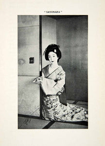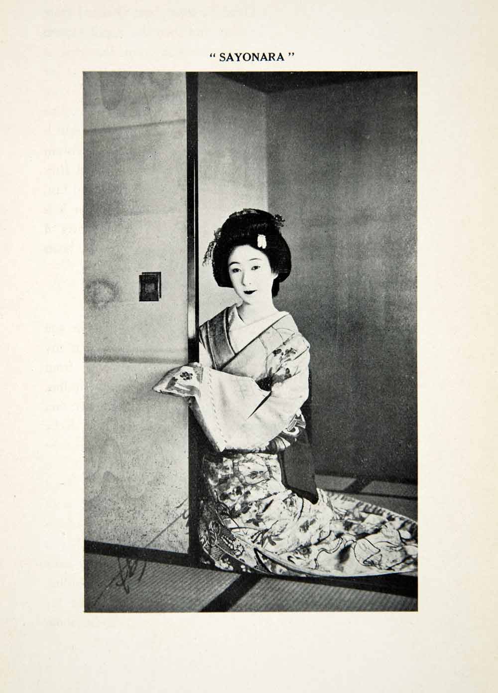 This is an original 1937 monochrome halftone print that depicts a beautiful Japanese hostess wishing her visitors goodbye.