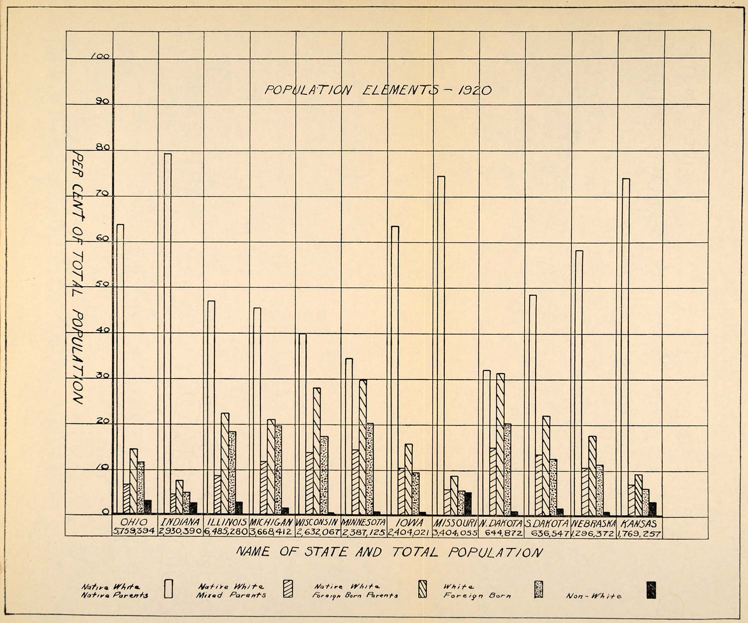 This item shows the total population of the states of Ohio, Indiana, Illinois, Michigan, Wisconsin, Minnesota, Iowa, Missouri , North Dakota, Nebraska and Kansas during the year of 1920.