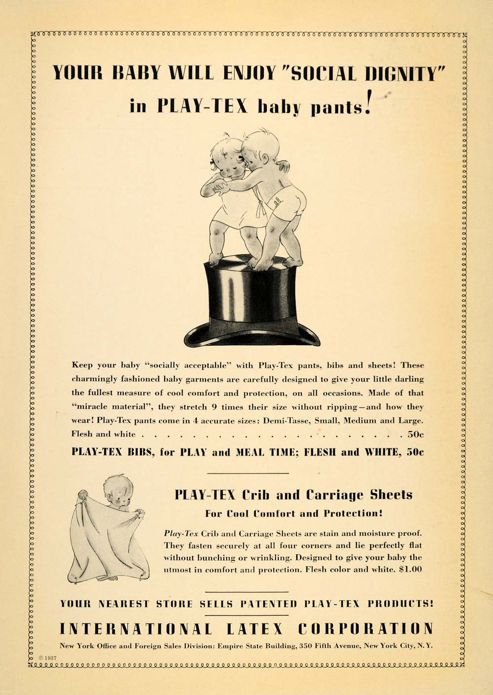 This is an original 1937 black and white print ad for Play-Tex Baby Pants, Bibs, Crib and Carriage Sheets from the International Latex Corporation.