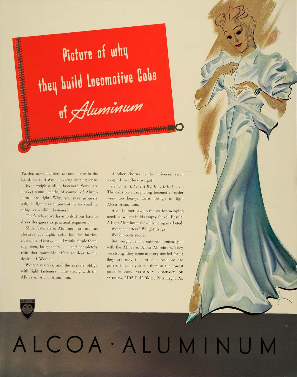 This is an original 1938 color (with silver ink) print ad for Alcoa Aluminum. (Please note that the areas with silver ink appear gray in our digital image.)