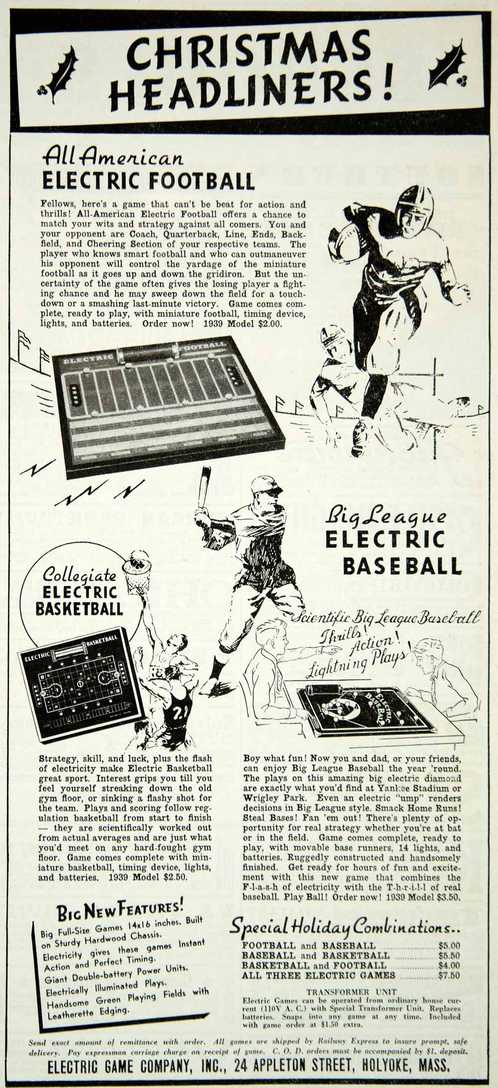 This is an original 1938 black and white print ad for the All-American electric football, Big League electric baseball, and Collegiate electric basketball toys that were made and sold by the Electric Game Company, Inc., of 24 Appleton Street, Holyoke, Massachusetts.